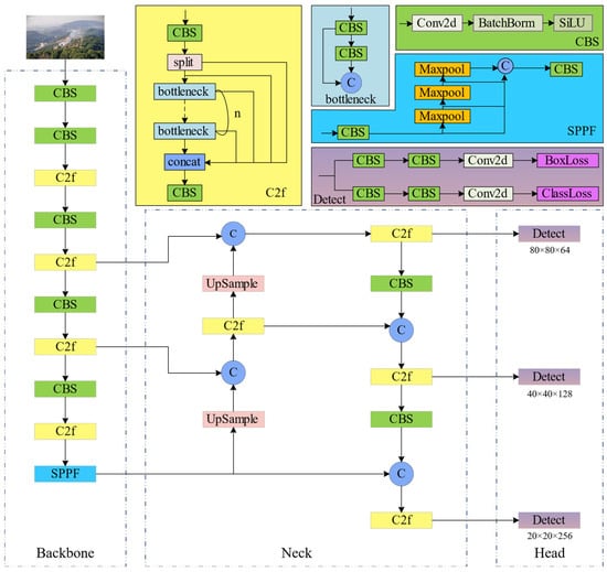 Backbone mainly consists of three modules: CBS (Convolution Block with SiLU activation), C2f (Cross-Stage Partial architecture with bottlenecks) and SPPF (Spatial Pyramid Pooling Fusion). CBS executes essential convolutional operations, incorporating 2D convolution, BatchNorm and SiLU activation functions. C2f adopts the innovative CSP (Cross-Stage Partial) architecture, which includes one split, two standard convolution layers and multiple bottleneck modules for feature extraction. SPPF module utilizes a collection of smaller pooling kernels that replace a solitary large pooling kernel. The fusion of features is accomplished by juxtaposing the feature map that has not undergone pooling with the feature maps produced after successive pooling operations. This method further optimizes the operational speed while preserving the potential for feature fusion across a wide receptive field. Neck is located between the Backbone and the output end. The proposed model incorporates the architectural design principles of both the FPN (Feature Pyramid Network) and PAN (Pyramid Attention Network), which consists of CBS, Upsample, Concat and C2f without shortcuts. The CBS within Neck is primarily responsible for extracting high-level semantic information via downsampling. C2f concentrates on extracting texture features from images, paying less attention to location and detail information while extracting features and instead prioritizing semantic information. Extracted texture features are subsequently integrated with other features and channeled to the prediction layer, thus enhancing the ability of network feature fusion. Head uses the previously acquired features to make predictions and treats the classification task separately from the detection task. For the classification task, the cross-entropy loss function (BCE Loss) is still used to ensure the accurate classification of different categories. For the detection task, DFL (Distribution Focal Loss) and CIoU (Complete Intersection over Union) are adopted. DFL can better deal with the problem of class imbalance, which is helpful to improve accuracy. Simultaneously, the CIoU loss function effectively optimizes the position prediction of the detection boxes, further enhancing the performance of the detection and the ability of network feature fusion.