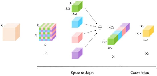 Conventional CNN typically uses pooling layers and strided convolutions to decrease the spatial dimensions of images and extract features. However, for images with low resolution or small objects, these traditional methods may result in information loss or blurring, which can lead to a decline in overall performance. In this regard, Sunkara et al. [24] proposed a new CNN building block that eliminates the need for strided convolution and pooling. This building block is designed to handle low-resolution images or small-size objects more effectively. As shown in Figure 3, this innovative building is named SPD-Conv. It is composed of a space-to-depth layer and a non-strided convolution layer, which downsamples the feature map and retains all the information of the channel dimension. In detail, a feature map denoted X has dimensions S × S × C1. It initiates by segmenting this feature map N times along the channel dimension of the S × S plane (N = 2 in the provided illustration). Each resultant subfeature map stemming from this division retains the same number of channels, while the length and width shrink to S/N. These subfeature maps are merged along the channel dimension. The merged subfeature map X1 undergoes convolution through a non-strided convolution layer to obtain a feature map X2 that retains as much feature information as possible.