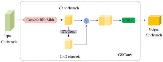 Conventional convolution requires extensive computation when dealing with large amounts of data, which can potentially result in slower training speeds. In order to overcome this problem, researchers put forward lightweight convolution [25,26]. By limiting the depth and width of the model, computational demands can be controlled, rendering it more suitable for deployment. Many lightweight networks employ a considerable amount of DSC (Depthwise Separable Convolution), but this often results in decreased detection accuracy. As a solution to this problem, Li et al. [27] proposed a new lightweight convolution known as GSConv. GSConv combines depth-separable convolution with standard convolution, uses depth-separable convolution to reduce the computational complexity and, at the same time, mitigates the low recognition accuracy caused by the poor feature extraction and fusion ability of depth-separable convolution via standard convolution. In forest fire detection, the model is too large to be deployed. To achieve comparable detection accuracy while reducing network computation, the GSConv module was used in this paper. The module’s structure, depicted in Figure 4, encompassed Conv, DWConv, Concat and shuffle operations. The input feature map obtains the information that the number of channels is half of the number of output channels via a standard convolution. In the case where the number of channels remains unchanged via the depth-separable convolution, the two channels are then spliced together to recover the original number of channels. The final result is output through the Shuffle module.
