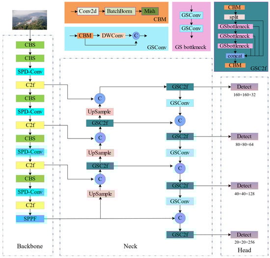 In addition to focusing on the accuracy in practical applications, the computational cost is also worth considering. So, this paper selects YOLOv8n as the base model, which downsamples using strided convolution that is susceptible to information loss. With the aim of enhancing the model’s detection ability, we consider increasing the channel depth to enhance feature extraction. This way, during downsample, it can effectively reduce the loss of fine-grained information and mitigate the impact of insufficient feature learning, while preserving more discriminative information. To achieve this, we modify the structure. First, we modify the feature extraction part. We introduce SPD-Conv module in the feature extraction phase and add it before each C2f module. The space-to-depth layer divides the input feature map into spatial blocks and then rearranges the pixels in each block to form a new feature map with a smaller size, enabling downsampling. Second, we modify the feature fusion part. We replace the standard convolution of the Neck with GSConv. Applying it to the whole model would greatly deepen the network and increase the inference time, so it is only used in Neck. Based on GSConv, the structure of the GS bottleneck module uses 1 × 1 convolution to reduce the number of channels by half, and then 3 × 3 convolution doubles the channel count. Notably, the bottleneck in the Neck does not use a shortcut. After that, changing the activation function means changing CBS module to CBM module. The bottleneck in C2f module is replaced with GSbottleneck, and three GSbottlenecks are connected in series, which enhances accuracy while greatly reducing the number of parameters. Finally, we modify the feature processing part. There are only three detection scales in the YOLOv8 network structure, which predicts small, medium and large objects after downsampling the input image with a size of 640 × 640 sequentially. However, the smoke dataset contains smaller detection targets; using three detection heads results in insufficient utilization of shallow feature information, which causes a decrease in detection accuracy. Therefore, in this paper, we add a detection head for detecting smaller targets, building upon the foundation of the initial prototype. The improved model is depicted in Figure 5. We increase the channel depth using two convolutional structures that efficiently downsample to preserve feature details within the channel dimension while maintaining a balance between computational efficiency and performance enhancement.