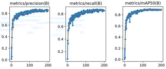 The convergence process of Precision, Recall and mAP50 during the training of the improved model is shown in Figure 6. In the initial 50 epochs, there is a rapid increase in Precision, Recall and mAP50 metrics, indicating significant progress in the model’s performance. Subsequently, substantial accuracy levels are attained following 100 epochs of training. Remarkably, the model reaches near-optimal performance around 150 epochs, underscoring its efficacy and robustness in terms of Precision, Recall and mAP50 metrics.