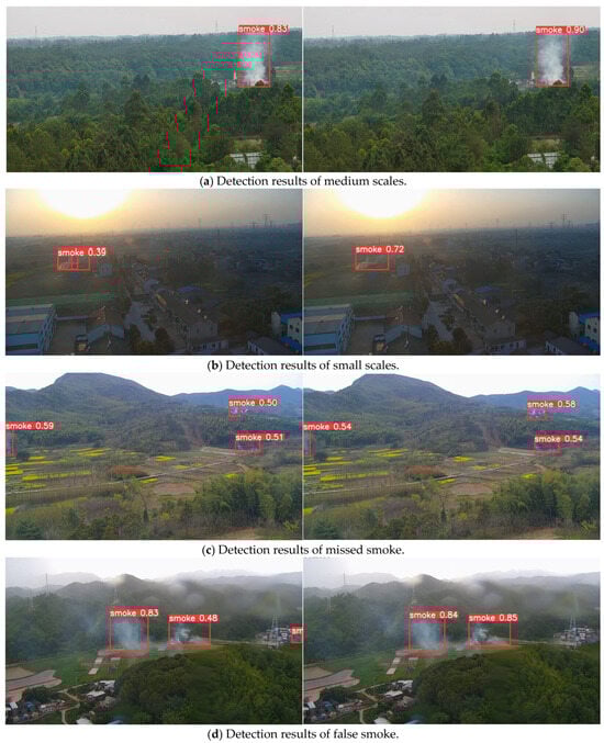 From these experiments, it is evident that our improved YOLOv8 model demonstrates its effectiveness in detecting small and inconspicuous smoke, surpassing other models in terms of accuracy at various scales. The detection performance, both pre- and post-enhancement, is displayed in Figure 7. As shown in Figure 7, the outcomes of the enhanced model show no instances of false or missed detections. Furthermore, the bounding boxes demonstrate a remarkable level of precision as they effectively encapsulate the entirety of the smoke objects.