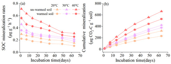 In both warm and un-warmed soils, SOC mineralization rate increased with the increase of incubation temperature (Figure 1a). Additionally, the cumulative SOC mineralization from un-warmed soil was consistently higher than that from warmed soil at the same incubation temperature (Figure 1b). This aligns with many studies suggesting that higher temperature can intensify C mineralization and subsequently increase soil CO2 emission [12,16,45]. For instance, Gudasz et al. [47] also found that cumulative SOC mineralization escalated with increasing temperatures. Furthermore, our study indicated that greater SOC mineralization in un-warmed soil could be linked to the higher DOC and MBC levels in un-warmed soil than in warmed soil. Specifically, labile SOC contents, including DOC and MBC, were found to be 39%–66% and 20%–31% greater in the un-warmed soil (Table 3). For example, in the Great Hing’an Mountains in temperate northeast China, between 1.3% and 2.1% of SOC was mineralized over a 42-day period at 15 °C without 13C-glucose [14]. Similarly, research from Northeastern China’s permafrost peatlands demonstrated 0.6%–11.1% decreases in SOC after 90-day incubation at 15 °C [13]. Contrastingly, in tropical and subtropical forests, SOC mineralization recorded between 2% and 7% [48,49].
