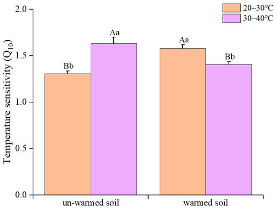 Regarding temperature sensitivity, variations in Q10 were observed for QT20 and QT30 between the two soils (Figure 2). The Q10 of 20–30 °C (QT20) and 30–40 °C (QT30) of the two soils varied significantly (Figure 2). The QT20 of the warmed soil (1.31 ± 0.03) was higher than that of the un-warmed soil (1.63 ± 0.07), but the QT30 of the warmed soil (1.58 ± 0.04) was lower than that of the un-warmed soil (1.41 ± 0.03) (Figure 2).