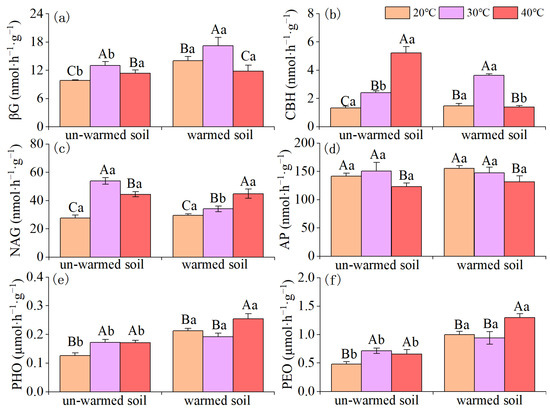 In un-warmed soil, when the incubation temperature increased from 20 °C to 30 °C, the activities of soil βG, CBH, NAG, PHO, and PEO enzymes significantly increased. Increasing the incubation temperature from 30 °C to 40 °C, CBH activity continued to increase while βG, NAG, and AP enzyme activities decreased significantly. Oxidase activity showed no significant change. Moreover, at incubation temperature of 40 °C, all enzyme activities except for AP were higher than at 20 °C. In warmed soil, increasing the incubation temperature from 20 °C to 30 °C, warming significantly increased the activities of soil βG, CBH, and NAG enzymes; increasing the incubation temperature from 30 °C to 40 °C, βG, CBH, and AP enzyme activities decreased significantly while NAG, PHO, and PEO enzyme activities increased significantly. Furthermore, at incubation temperature of 40 °C, NAG, PHO, and PEO enzyme activities were significantly higher than at 20 °C (Figure 3).