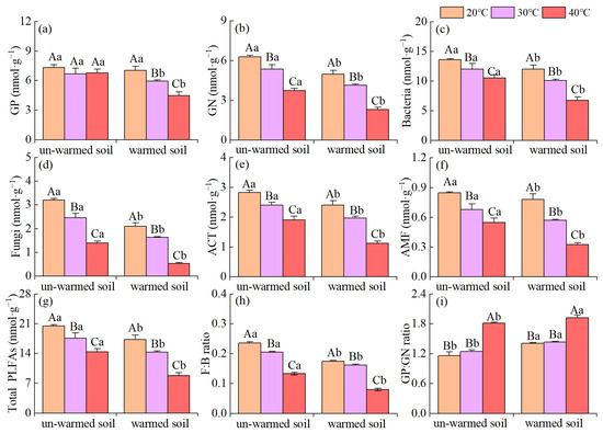 Effects of incubation temperature on the phospholipid fatty acid biomarker contents (in nmol g−1 soil) between un-warmed soil and warmed soil. (a) GP, total Gram-positive bacteria biomass; (b) GN, total Gram-negative bacteria biomass; (c) total bacteria biomass, the sum of GP, GN and unspecific bacteria; (d) fungi, total fungi biomass; (e) ACT: actinomycetes; (f) AMF, arbuscular mycorrhiza fungi; (g) Total, total microbial PLFAs; (h) F:B ratio, the ratio of total fungi to total bacteria biomass; (i) GP:GN ratio, the ratio of total Gram-positive bacteria to Gram-negative bacteria biomass. Bars are standard deviation (n = 3). Different capital letters denote significant difference among incubation temperatures and different lower-case letters denote significant difference between un-warmed soil and warmed soil at the same incubation temperature (p < 0.05).