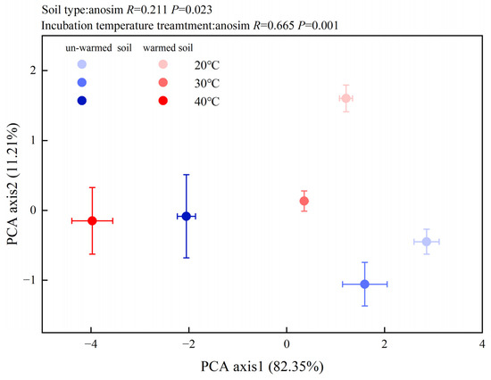 The microbial community composition was also significantly impacted by temperature changes (Figure 4). All the PLFA biomarkers showed a decreasing trend (except for GP in the un-warmed soil). The PLFA of total microbes, total bacteria, GN, AMF, ACT, and fungus of the warmed soil significantly (p < 0.05) decreased compared to those of the un-warmed soil (Figure 4). Moreover, 40 °C incubation significantly increased the ratio of Gram-positive bacteria to Gram-negative bacteria (GP:GN) for both soils and the ratio was significantly higher in the warmed soil than in the un-warmed soil (Figure 4). Increasing the incubation temperature significantly decreased F:B for both soils and the ratio was also significantly higher in the warmed soil than the un-warmed soil for each incubation temperature (Figure 4). The first principal component of the PLFAs pattern explained 82.35% of the variation in the data, while PC2 explained another 11.21% (Figure 5). According to the results of ANOSIM, there were significant differences in microbial community results between soil treatment and temperature treatment (p < 0.05) (Figure 5).