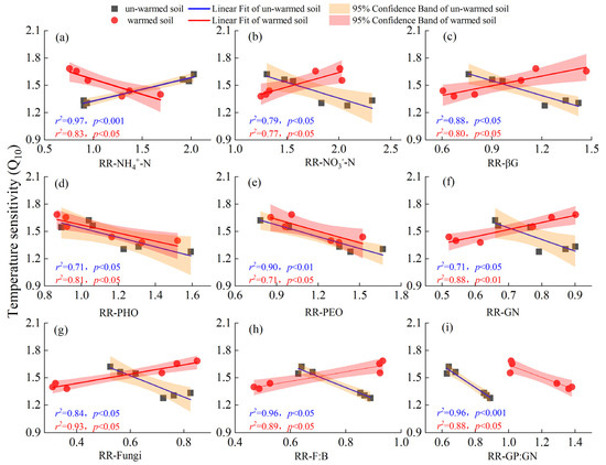 Relationships between temperature sensitivity (Q10) over two temperature ranges (20–30 °C (QT20) and 30–40 °C (QT30)) and the response ratios (RRs) of NH4+-N (a), NO3−-N (b), βG (c), PHO (d), PEO (e), GN (f), Fungi (g), F:B (h) and GP:GN (i). Black square and red point represent correlations in un-warmed and warmed soil, respectively. Blue and red lines represent relationships in un-warmed soil and warmed soil, respectively. Orange and red ranges represent 95% confidence interval in un-warmed soil and warmed soil, respectively.