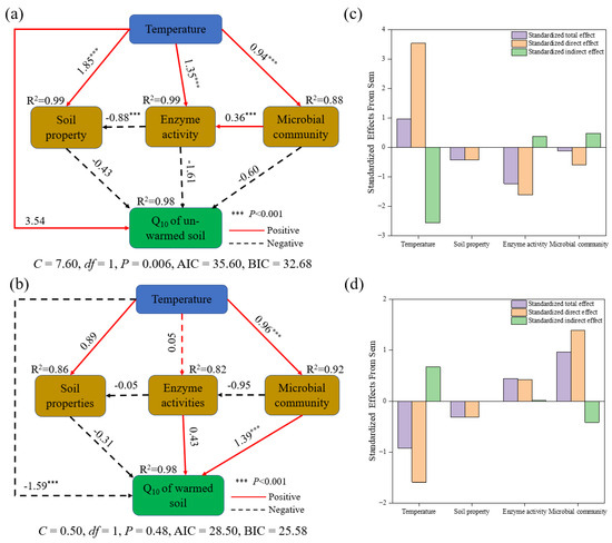 Structural equation model exploring the direct and indirect effects of incubation temperature, soil property, enzyme activity, and microbial community on the Q10 of soil organic carbon mineralization under un-warmed soil (a) and warmed soil (b). The histogram in panel represents the standardized direct or indirect effect of each variable from the corresponding SEM analysis ((c) un-warmed soil; (d) warmed soil). The soil properties are contents of NH4+-N, NO3−-N, MBC, MBN, DON, and DOC. The enzyme activities are contents of βG, CBH, APC, NAG, PHO, and PEO. The microbial communities are contents of GP, GN, ACT, AMF, fungi, bacteria, and F:B. The blue boxes indicate the incubation temperature; the green boxes indicate the target factor (e.g., the Q10 of soil organic carbon mineralization of un-warmed soil and warmed soil, respectively); the orange boxes indicate the biological and abiotic factors (e.g., soil properties, microbial communities, and enzyme activities). The numbers adjacent to the arrows are standardized path coefficients. The solid lines indicate a positive effect, and the dashed lines indicate a negative effect. The proportion of variance explained (R2) appears alongside each response variable in the model.