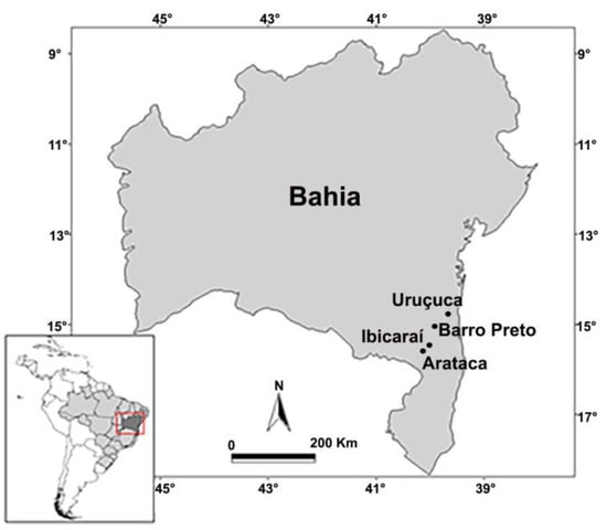 Leaf samples were collected from adult trees from four natural populations of Brazilian rosewood in the southern region of Bahia, Brazil. Sample sites were selected within a maximum distance of 80 km of each other, and leaves were collected from 35 individuals per population, totaling 140 trees (Figure 1). The populations are found in areas with different degrees of anthropic disturbance in the Atlantic Forest. The population of Ibicaraí (14°51′54″ S 39°35′16″ W) lies in a preserved forest in the Manacá—RPPN Manacá (RPPN means “Private Natural Heritage Reserve” from the Portuguese Reserva Particular do Patrimônio Natural). The population of Barro Preto (14°48′36″ S 39°28′15″ W) lies in a rainforest region with evidence of human occupation in the RPPN Pedra Lascada. The population of Arataca (15°15′46″ S 39°24′50″ W) includes a cabruca typical of southern Bahia and is located on a farm (Fazenda Jaci). The cabruca is an agroforestry system that keeps a thinned layer of native canopy species that provide shade for the cacao trees [25] and is a more permeable matrix in comparison to other crops [26]. The population of Uruçuca (14°35′34″ S 39°17′02″ W) lies within a pasture area. The sampled individuals had a diameter at breast height (DBH) equal or superior to 15 cm and were from 60 to 100 m apart.