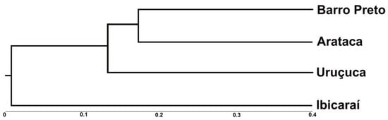The Brazilian rosewood populations were highly structured as estimated by the statistic θp value equal to 0.118 (Table 3). Both the FST values calculated without considering null alleles and the FST values with ENA correction showed that there was genetic differentiation between the populations. Genetic differentiation for all pairwise combinations between populations was significant, and the populations of Uruçuca and Barro Preto showed the greatest differentiation from the others (Table 4). Additionally, these two populations were genetically more distant in the UPGMA clustering analysis (Figure 2). The lowest genetic distance was observed between Ibicaraí and Arataca populations, compared to the Uruçuca population. Notably, the population pairs found to be most genetically divergent were those that were most geographically distant (Figure 1 and Figure 2). These estimates can be considered moderate and suggest a limited historical gene flow among these four populations ().