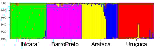 Govindaraju [61] distinguished three levels of gene flow: high (Nm > 1), intermediate (0.25 < Nm < 0.99), and low (Nm < 0.25). The gene flow detected in this study (.092) and the number of private alleles (46) was relatively high. According to Wright [62], a single migrant per generation is sufficient to avoid the effects of genetic drift and inbreeding among small populations. However, gene flow disruption plays an essential role in speciation. The low gene flow after the fragmentation between populations analyzed may explain the high estimates of FST. As few cpDNA haplotypes were observed in southeastern Bahia [24], we hypothesized that there would have been a metapopulation in the past. But, as fragmentation is recent, no such high levels of genetic structuring were found. However, our data revealed that different populations within 80 km diverge when analyzed by SSR. In this study, besides the frequency statistic (FST and Nm), we used probabilistic statistics (Bayesian), which revealed that these populations are evolving independently but can still preserve the species’ genetic diversity. The results obtained by Bayesian statistics are consistent with the estimates of parameters of genetic structure based on frequency statistics (FST and Nm). The divergence might be caused by inbreeding, genetic drift, and reduced gene flow. Results obtained from the analysis of genetic structure without a priori hierarchy confirmed that conserving the genotypes of the populations studied would be prudent. We reaffirm the need for the creation of corridors for the maintenance of gene flow and hence homogenization of allele frequencies of these populations.