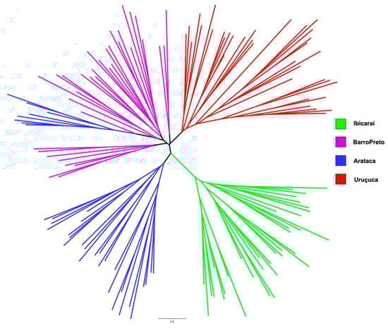 The clustering-based Bayesian model was applied to detect the genetic structure of 140 individuals of Brazilian rosewood. According to the ΔK values [44], the highest log likelihood scores were found when the number of groups was set at five (Figure 3 and Figure S1), ΔK = 5, indicating the assemblage of most individuals within their respective collection population. Clustering analysis confirmed the isolation pattern detected with θ statistic. In agreement with the structure analysis, the neighbor-joining tree showed that the individuals tended to form groups similar to their respective collection population, evidencing a significant population structure (Figure 4).