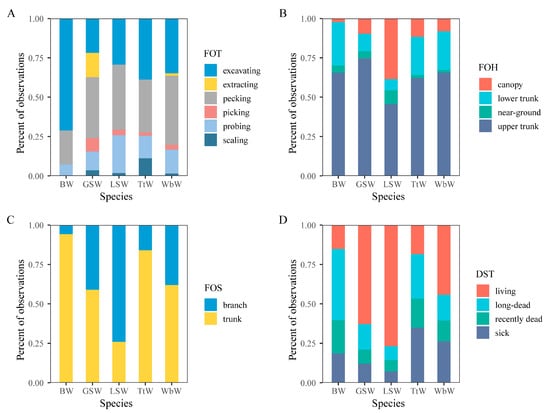 Relationship between foraging frequency and foraging technique: (A), foraging height (B), foraging site (C), and decay status of trees (D) of five woodpecker species in broadleaved Korean pine forests of Northeast China. BW: Black Woodpecker (Dryocopus martius); GSW: Great Spotted Woodpecker (Dendrocopos major); LSW: Lesser Spotted Woodpecker (Dendrocopos minor); TtW: Three-toed Woodpecker (Picoides tridactylus); WbW: White-backed Woodpecker (Dendrocopos leucotos).