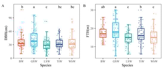Comparison of DBH (A) and FTH (B) among five woodpecker species in broadleaved Korean pine forests of Northeast China. See Figure 1 for species codes. In the boxplot, the boxes represent the middle 50% of scores, the horizontal lines represent the medians, observed values are represented using translucent dots, and whiskers include the range of distribution without outliers. Different letters above the boxes illustrate significant differences in DBH and FTH among the five woodpecker species. BW: Black Woodpecker; GSW: Great Spotted Woodpecker; LSW: Lesser Spotted Woodpecker; TtW: Three-toed Woodpecker; WbW: White-backed Woodpecker.