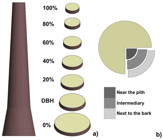 Discs 5 cm thick were cut along the trunk at positions corresponding to 0% (base), DBH, 20%, 40%, 60%, 80%, and 100% of the total height (Figure 2a). The samples were prepared for the physical analysis of the wood using ¼ wedges of each disc (Figure 2b). From each fraction, three samples with irregular shapes and sizes were taken in the radial direction (close to the pith, intermediate, and close to the bark).