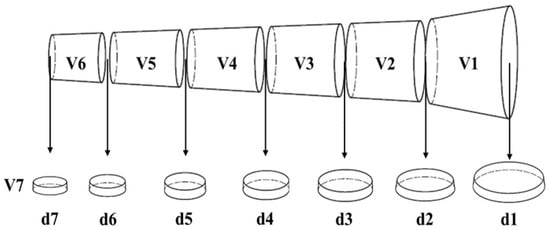 Disc collection positions (di) and their respective volumes (Vi) used to determine the weighted basic density of the tree (adapted from [18]).