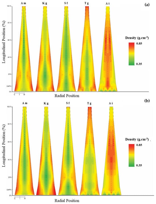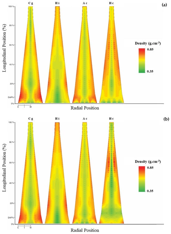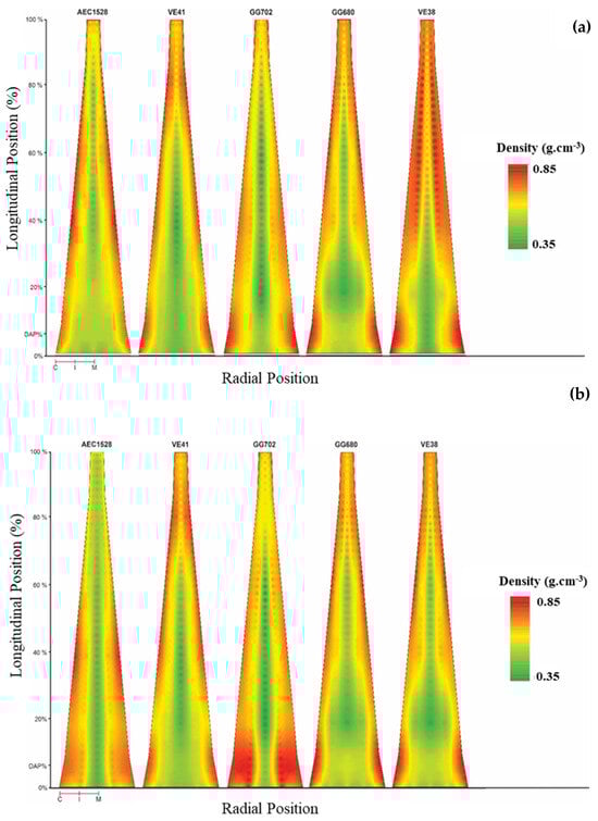 Density is one of the main properties evaluated in wood. According to Müller [9], this property presents a good relationship with other characteristics, such as mechanical resistance and stiffness, in addition to being determined from a simple test [10,11]. This property varies according to the position of the wood in the trunk, both longitudinally (base–top) and radially (pith–bark), which also causes changes in the other correlated properties. The variation in these two axes is influenced by anatomical, chemical, and physical differences that occur along the stem and is explained by changes in fiber length, proportions of cell types, cell diameter, cell wall thickness, and lignin, among others. These are, in turn, conditioned by genotype factors, tree age [12], and environmental conditions [13].