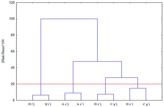 Dendrogram of the influence of irrigation management on the basic density of four native species native from Brazil, established in the region of Marco—CE. Identification of the analyzed species represented by the letters: A c—A. colubrina; C g—C. glandulosa; H c—H. courbaril e H i—H. impertiginosus. The letters “i” and “j” represent irrigation time adopted for each area, with “i” equivalent to 36 months, and “j” equivalent to 12 months.