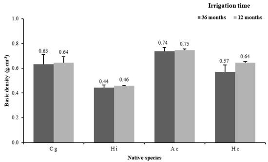The average values of basic density of the four native species evaluated for the two different irrigation management conditions can be seen in Figure 9. In this group of species, according to Zaque et al. [20], only the species A. indica was classified with a moderately heavy basic density. All others were classified as light basic density woods. When evaluating the global average of native trees of each species, it was verified that the highest basic density was found in the species A. indica in both treatments, followed by the species C. glandulosa when subjected to irrigation conditions for less time (12 months after planting).
