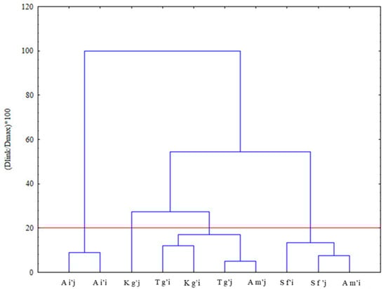 Dendrogram of the influence of irrigation management on the basic density of five exotic species, established in the region of Marco—CE. Identification of the analyzed species represented by the letters: A m—A. mangium; K g—K. grandifoliola; S f—S. foetida; T g—T. Grandis; A i—A. indica. The letters “i” and “j” represent irrigation time adopted for each area, with “i” equivalent to 36 months, and “j” equivalent to 12 months.