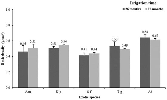 Basic density in five exotic species cultivated in two irrigation regimes, implemented in the region of Marco—CE. Identification of the analyzed species represented by the letters: Am—A. mangium; K g—K. grandifoliola; S f—S. foetida; T g—T. Grandis; A i—A. indica.