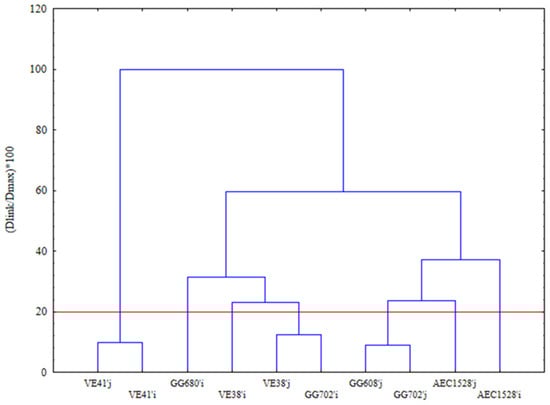 Dendrogram of the influence of irrigation management on the basic density of five Eucalyptus clones, implemented in the region of Marco—CE. Identification of analyzed clones represented by letters and numbers: AEC1528—E. urophylla × E. grandis; VE41—E. urophylla × E. grandis; GG702—E. urophylla; GG680—E. urophylla × E. grandis; VE38—E. urophylla × E. camaldulensis. The letters “i” and “j” represent the irrigation time adopted for each area, with “i” equivalent to 36 months, and “j” equivalent to 12 months.