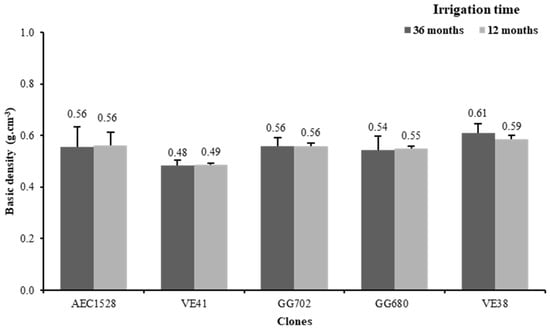 Basic density (g·cm−3) in five Eucalyptus clones cultivated in two irrigation regimes, implemented in the region of Marco—CE. Identification of analyzed clones represented by letters and numbers: AEC1528—E. urophylla × E. grandis; VE41—E. urophylla × E. grandis; GG702—E. urophylla; GG680—E. urophylla × E. grandis; VE38—E. urophylla × E. camaldulensis.