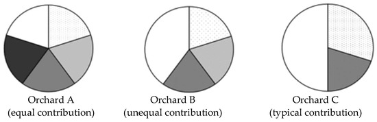 In Equations (1), (2), (5), (6) and (10), fertilities are related to the coefficient of variation (CV). Forest owners and seed source managers expect equal parental gamete contribution from all parents to decrease the CV value (Figure 1). In orchard A, all parents contribute equally, so there are no fertility variations, and the census number for the orchard is the same as the status number of the orchard crop [11,18].