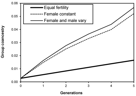 Here, N is the census number, fi is the female fertility, mi is the male fertility of the individual i, and pi is the probability that two genes in the offspring come from the same parent i. The accumulation of group coancestry is faster and higher when the fertility variation is large [10,11,33], as shown in Figure 2.