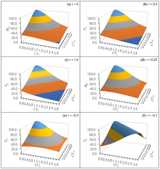 Stochastic simulation of the effective number of parents (Np) with female and male fertility variations (CVf, CVm) under various covariation (correlation coefficients, r) between female and male reproductive outputs, where the census number is 100 (N = 100) in the population. Reproduced with permission from [67].