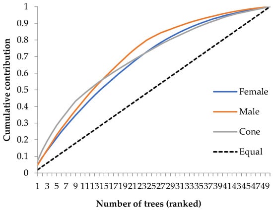 Variations in the parental contribution among families could be described using the parental cumulative curve shown in Figure 4. The cumulative contribution curve is linear, and the dotted diagonal line in Figure 4 denotes equal fertility among trees.