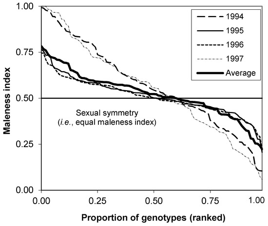 Maleness index calculated for individual clones of 99) based on the observations of strobilus production for 4 years. The horizontal line shows where the average contribution for reproduction is the same for both genders. Reproduced with permission from [68].