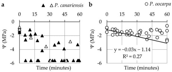 Needle water potential was measured with a Scholander-type pressure chamber (PMS Instrument Co., Albany, OR, USA) in needles cut at approximately 10 min time intervals. No water potentials below −5.6 MPa were measured, so we could keep the pace of 10 min between measurements in each plant. Thus, all values equal to −5.6 MPa in Figure 1 correspond to lower but unknown water potentials. We calculated the maximum rate of decrease in Ψ using linear equations fitted to data measured during the first 15 min of hot wind for all species except P. canariensis, the only one in which Ψ reached values below −5.6 MPa.