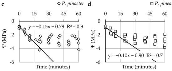 Daily minimum Ψ tends to be higher in species with higher stem hydraulic conductance [48,49]. Tree species with lower stem hydraulic conductance may need to reach lower leaf water potentials to increase sap flow and sustain transpiration. By generating a steep water potential gradient, P. pinea and P. pinaster would promote water transport from the stem in order to limit further needle dehydration or even allow needle rehydration in a strategy of needle preservation. This effect was noticeable in P. pinaster, in which needle WC, RWC, and Ψs increased between 30 and 60 min of hot wind.