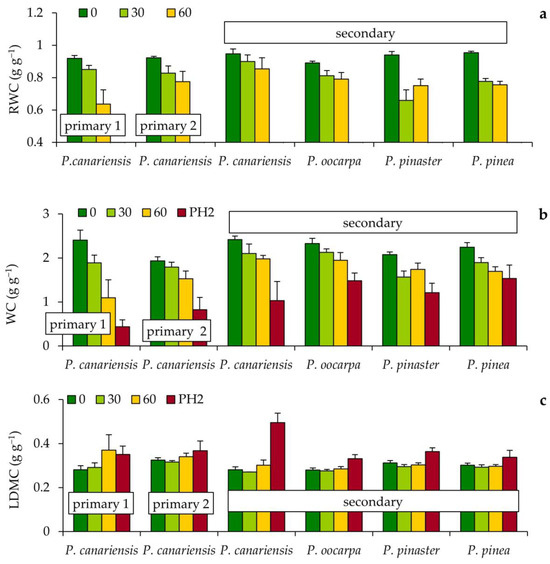 Mean ± SE values of (a) needle relative water content, (b) needle water content expressed on a dry weight basis, and (c) leaf dry matter content, calculated as the quotient of needle dry weight to needle saturated weight. Values were measured in secondary (all species) and primary (P. canariensis) needles from five two-year-old seedlings belonging to four pine species. Primary needles were classified either as primary 1 (taken from the apex and tender) or primary 2 (fully developed). Values were measured before (0) and after exposing the seedlings to 30 and 60 min of hot wind (Phase 1) and after applying extremely hot wind (Phase 2, PH2). See text for further details.