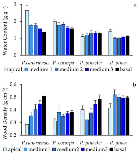 The lowest values of stem density were measured in the most apical stem portions from resprouting species (Figure 4b). Both the effects of height (F4,74 = 7.8, p < 0.001) and species (F3,74 = 74, p < 0.001) were highly significant. The effect of the interaction between factors was also significant (F12,74 = 2.01, p = 0.030). Pinus canariensis was the only species in which stem density increased steadily from the apex to the base of the stem (Figure 4b) and the one in which the difference in density between basal and apical stem portions was the largest (44% vs. 16%–18%).