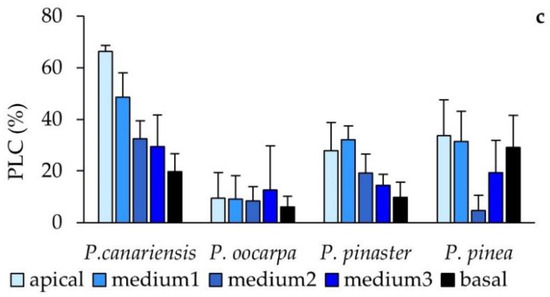 The average percentage loss of hydraulic conductance (PLC) measured at five heights along the stem ranged from 5% to 66%. The highest values were measured in the most apical stem segments of P. canariensis, while PLC was consistently lower than 13% throughout the stem in P. oocarpa (Figure 4c). Factorial ANOVA showed a significant effect of the species on PLC (F3,68 = 9.68, p < 0.001), a non-significant effect of the position of the segment along the stem (F4,68 = 1.66, p = 0.17), and non-significant interaction between factors (F12,68 = 0.97, p = 0.48).