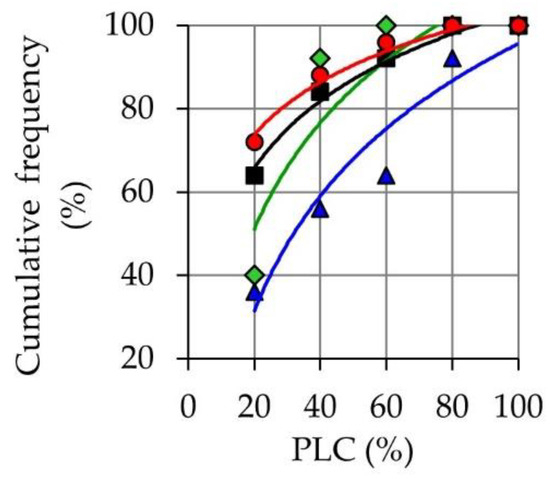 Cumulative frequency curves for the percentage loss of hydraulic conductance (PLC) measured in stem segments taken from two-year-old seedlings belonging to four pine species. Data are grouped into five PLC classes (n = 25 for each species). For each class, the figure shows the percentage of data in which a PLC equal to or lower than the upper-class limit was measured in each species. Logarithmic functions were fitted to each set of data points (R2 > 0.8 for all the curves). Color code: P. oocarpa (red), P. canariensis (blue), P. pinaster (green), and P. pinea (black).