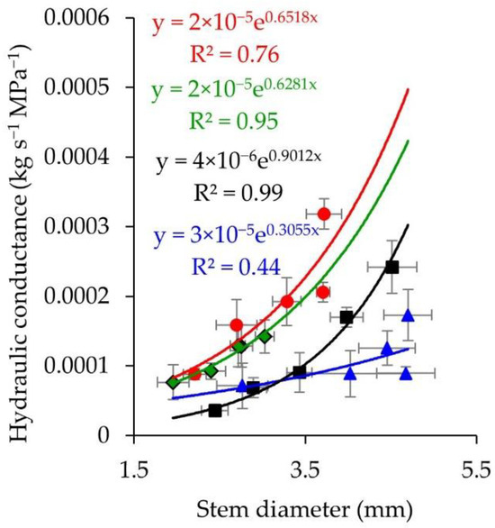 Mean ± SE values of maximum hydraulic conductance as a function of stem diameter, measured at five heights along the stem in five seedlings from four pine species. Data were fitted to exponential equations, which are given as an inset, from up to down the equations correspond to P. oocarpa (red circles), P. pinaster (green diamonds), P. pinea (black squares), and P. canariensis (blue triangles).
