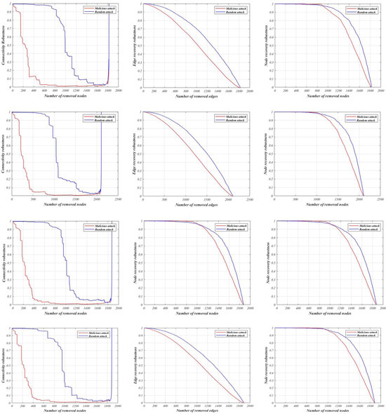 where N is the total number of nodes in the initial network, C is the number of nodes in the maximum connected subgraph after eliminating Nr nodes from the network, and R denotes the connectivity robustness. The number of nodes recovered by a certain approach is Nd, and D is the robustness of node recovery. Edge recovery robustness is measured by the letters E, Mr, Me, and M, where M is the total number of edges in the initial network, Me is the number of edges recovered by some approach, and Me is the number of edges deleted from the network.