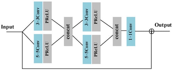 Basic structure of the Multi-Scale Residual Block (MSRB). In this diagram, “Conv” represents the convolution operation, and “PreLU” indicates the utilization of the Parametric Rectified Linear Unit (PreLU) activation function. The overall structure of the MSRB employs a dual-branch network, with different branches using distinct convolution kernels.