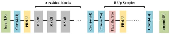 Basic structure of generator. At the input end, low-resolution images are fed in, and “Conv(3,64)” denotes the use of convolution for dimensionality expansion. The Parametric Rectified Linear Unit (PreLU) activation function is employed to introduce non-linearity. Subsequently, the input undergoes feature extraction through a Multi-Scale Residual Block (MSRB). After passing through the output layer, the image proceeds through B up-sampling modules, where the number of B modules is determined by the upscaling factor. Finally, convolution is used to reduce the number of channels to three for output.