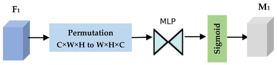 The channel attention module takes the feature matrix F1 obtained after VGG convolution as its input feature map, where the input feature map size is set to C × W × H, with H and W representing the input feature’s height and width, and C representing the number of channels. It undergoes a dimension transformation (C × W × H to W × H × C) and then feeds the dimension-transformed feature map into a two-layer Multi-Layer Perceptron (MLP) to amplify cross-dimensional channel-space dependencies. After processing, it is transformed back to dimension C × H × W and subjected to sigmoid processing to obtain the attention weight feature map M1, which is then multiplied with the input feature map to obtain the new feature map F2. The channel attention structure is depicted in Figure 4.