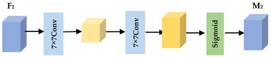 The spatial attention module takes the feature map F2 obtained from the channel attention module as its input feature map. It reduces its channel count to C/r (where r is set to 4) using a 7 × 7 convolution to reduce computational load. It then increases the channel count again using another 7 × 7 convolution to match the original channel count. Finally, it employs sigmoid processing to obtain the attention-weight feature map M2. After obtaining the weights, they are multiplied with the output feature layer F2 from the channel attention module to obtain the final dependency-enhanced feature matrix F3. The spatial attention structure is shown in Figure 5.