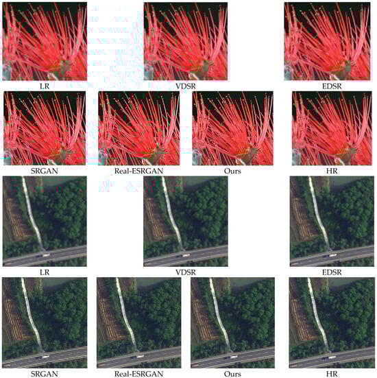 In this section, we conduct comparative experiments between our model and established models, namely VDSR, EDSR, SRGAN, and Real-ESRGAN. We use the DIV2K and LoveDA training datasets to train our model for 4× super-resolution, and the corresponding weights are obtained. Subsequently, we downscale the resolution of 100 test images from each dataset by a factor of four and evaluate the performance of each model in predicting the super-resolved images. We then combine the predicted results with the original test dataset to obtain the three evaluation metrics required in this study. The average evaluation metrics from this experiment are presented in Table 2. The experiments demonstrate that, in terms of evaluation metrics, the model proposed in this paper outperforms SRGAN with an increase in PSNR values of 0.709/2.213 dB, an improvement in SSIM of 0.032/0.142, and a decrease in LPIPS of 0.03/0.013. These results are on par with those achieved by Real-ESRGAN.