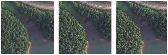 This experiment was conducted on a Linux server equipped with an NVIDIA 2080 Ti GPU with 11 GB of VRAM, 16 GB of RAM, and the following software stack: PyTorch 1.8, Python 3.8.5, CUDA 11.0, and cuDNN 8.0.4. The training data consisted of two parts: the publicly available DIV2K dataset [30] and the LoveDA dataset of single-frame remote sensing images in hilly terrain [31]. The DIV2K dataset contains 900 high-definition images (2K resolution), with 800 images used for training and 100 for testing. The LoveDA dataset, created by the RSIDEA team at Wuhan University, comprises a significant collection of single-frame remote sensing images. This dataset is constructed from 0.3-m imagery sourced from Google Earth, captured in July 2016, covering a total geographical area of 536.15 square kilometers in the regions of Nanjing, Changzhou, and Wuhan. All images are selected from undeveloped hilly areas and include abundant wild vegetation, water bodies, and sporadic buildings. After undergoing geometric registration and preprocessing, each region is covered by non-overlapping 1024 × 1024 images, as illustrated in Figure 8. For this study, 1000 single-frame remote sensing images were selected from LoveDA and used as a dataset for training the forest single-frame remote sensing images. Another 100 images were chosen as a test set.