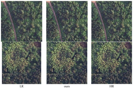 Additionally, we have collected FPS (Frames Per Second) data for each model. We conducted experiments in which 100 test images from both datasets were processed by each model in a loop to generate 4× super-resolved images. The data were measured after the models stabilized. It is worth noting that this data may vary depending on the experimental environment. The data are presented in Table 3. The results from both sets of experiments demonstrate that the model we propose achieves results in single-frame forest remote sensing images that are comparable to state-of-the-art methods while maintaining efficiency.