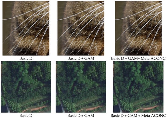 To validate the consistently positive effects brought by the attention mechanism and activation functions, ablation experiments were conducted. The experiments involved gradually adding three components, namely Basic G, GAM, and Meta ACONC, to the generator based on the MSRB backbone network and the conventional VGG network for the discriminator. These experiments were conducted by training the models for 4× super-resolution using the DIV2K and LoveDA training datasets to obtain their respective weights. The resolution of 100 test images from each dataset was downscaled by a factor of four, and the performance of each model in predicting super-resolved images was evaluated. The predicted results were then combined with the original test dataset to obtain the three evaluation metrics required for this study. The average evaluation metrics are presented in Table 5.