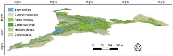 The Tianshan Mountains are the largest mountain range in the arid region of Central Asia, stretching across China, Kazakhstan, Kyrgyzstan, and Uzbekistan in an east-west direction (Figure 1a). Xinjiang, China, is home to sixty percent of the Tianshan Mountains. The Tianshan Mountains exhibit a temperate continental climate, with an average annual precipitation range of 27.4 to 673.2 mm (1990–2020) and average annual temperatures varying from −15.4 to 14.1 °C. The higher relative elevation ranges (−154 to 7439 m) have led to the formation of a relatively complete altitudinal vegetation belt in the Tianshan Mountains []. Ref. [] provided clarification on the average elevation range and composition of altitudinal vegetation belts within the Tianshan Mountains (Figure 1b). The climatic characteristics of vegetation belts at high elevations (>1500 m) are characterized by warm and humid conditions, and those at low elevations (<1500 m) are characterized by warm and dry conditions (Figure 1b). Land cover data from the Tianshan Mountains indicate that the natural vegetation types mainly include forests (tree cover), grasslands, and sparse vegetation (Figure 1c). Grasslands and sparse vegetation have the largest distribution, and both have an area proportion of more than 40% (Figure 1c). Although only comprising 3.4% of the total area, forests serve an important role as carbon sinks.